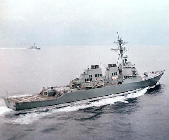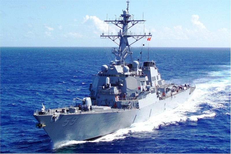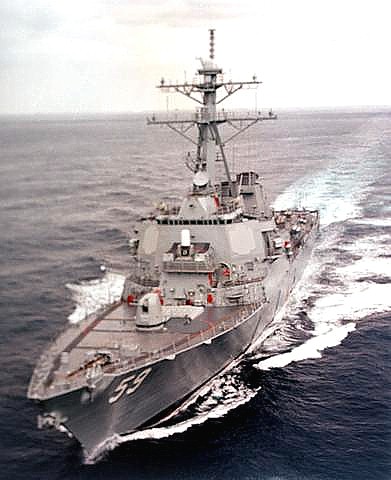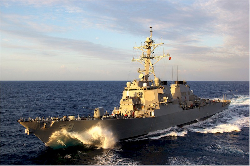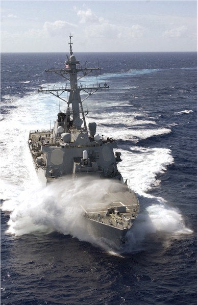 | 120k | 080905-N-7981E-311. Indian Ocean, September 5 2008, the Arleigh Burke-class guided-missile destroyer USS Russell (DDG 59) transits the Indian Ocean as part of the Abraham Lincoln Strike Group. The Abraham Lincoln Strike Group is on a scheduled deployment in the U.S. 7th Fleet area of responsibility operating in the western Pacific and Indian oceans. U.S. Navy photo by Mass Communication Specialist 2nd Class James R. Evans. | Robert M. Cieri |
