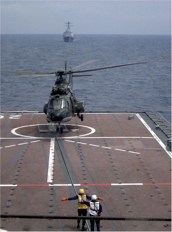 | 101k | A Republic of Singapore Air Force Super Puma helicopter takes off from the flight deck of the Republic of Singapore Ship (RSS) Resolution (LST 208), with the guided missile destroyer USS Russell (DDG-59) on the horizon, on 7 June 2004. U.S. Navy photo by Lt. Kevin Borden. | Robert Hurst |