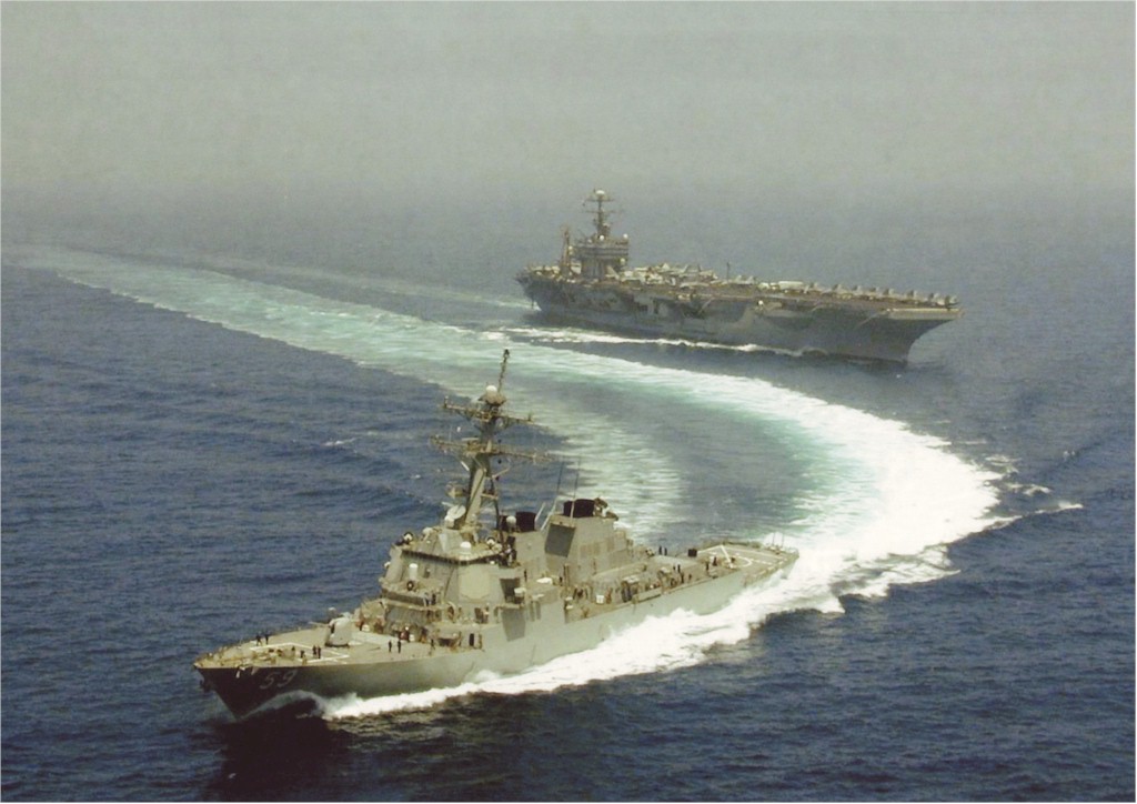 | 159k | 080905-N-8593M-057. Indian Ocean, September 5 2008, the Arleigh Burke-class guided-missile destroyer USS Russell (DDG 59), foreground, the Arleigh Burke-class guided-missile destroyer USS Momsen (DDG 92), the Ticonderoga-class guided-missile cruiser USS Mobile Bay (CG 53), and the Oliver Hazard Perry-class guided-missile frigate USS Curts (FFG 38) take part in a photo exercise alongside the aircraft carrier USS Abraham Lincoln (CVN 72). The Abraham Lincoln Strike Group is on a scheduled deployment in the U.S. 7th Fleet area of responsibility operating in the western Pacific and Indian oceans. U.S. Navy photo by Mass Communication Specialist 3rd Class Michael K. McNabb. | Robert M. Cieri |