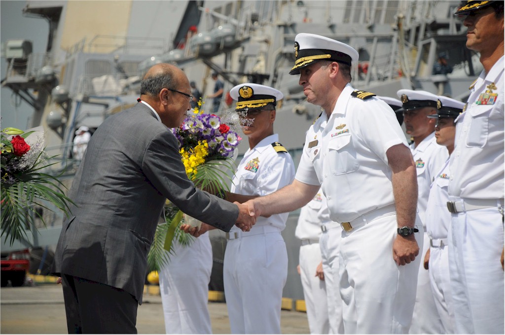 | 159k | 100723-N-3283P-054. Sendai, Japan, July 23 2010, Cmdr. Rodney Patton, commanding officer of the guided-missile destroyer USS Russell (DDG 59), greets a member of the Japan-America Society during a welcome ceremony at Takamatsu Pier. Russell is serving in the U.S. 7th Fleet area of responsibility and is visiting Sendai as part of the 50th Anniversary Commemoration of the United States-Japan Mutual Treaty of Cooperation and Security. U.S. Navy photo by Mass Communication Specialist 3rd Class Dominique Pineiro. | Bill Gonyo |
