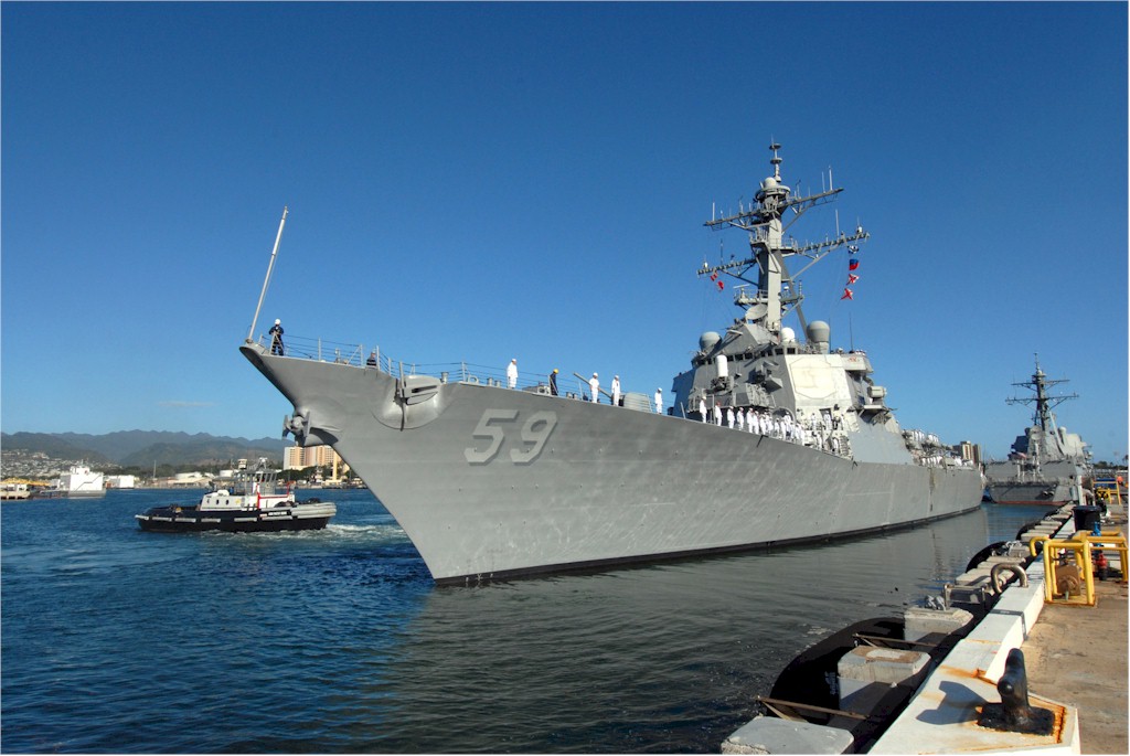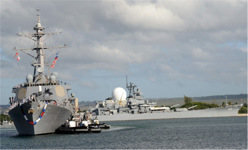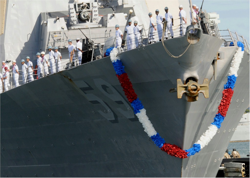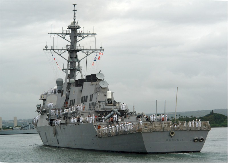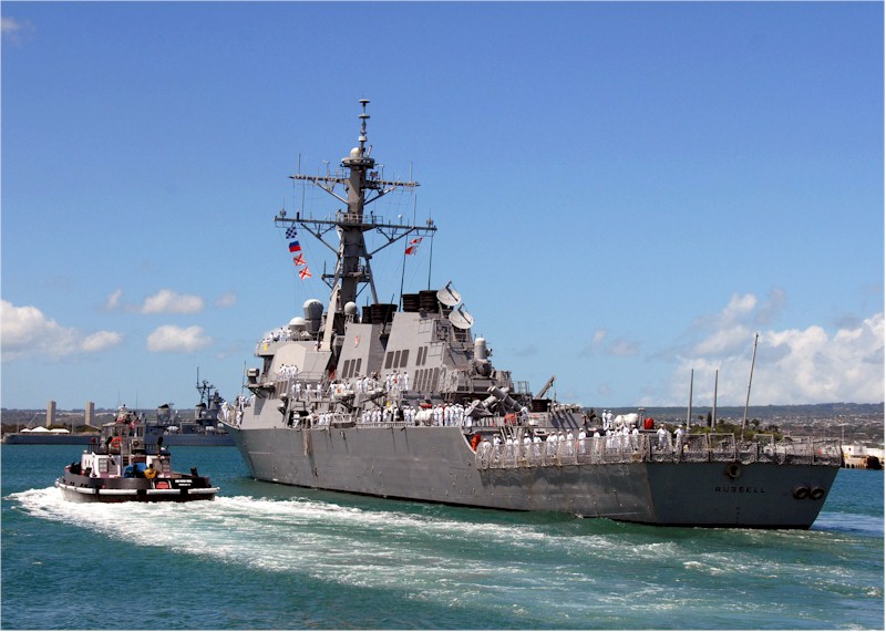 | 136k | 100806-N-3666S-037. Pearl Harbor, August 6 2010, the guided-missile destroyer USS Russell (DDG 59) arrives in Joint Base Pearl Harbor-Hickam after a scheduled seven-month deployment in the U.S. 5th and 7th Fleet areas of responsibility. While on deployment, Russell conducted operations in conjunction with coalition partners deployed to the Middle East, and with the Dwight D. Eisenhower Carrier Strike Group. U.S. Navy photo by Mass Communication Specialist 2nd Class Robert Stirrup. | Bill Gonyo |