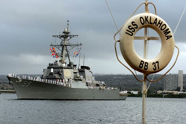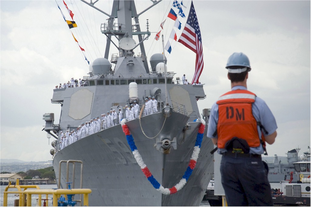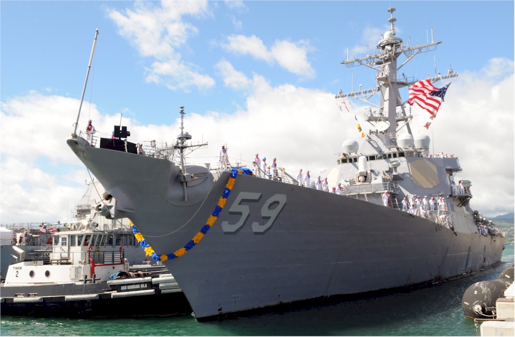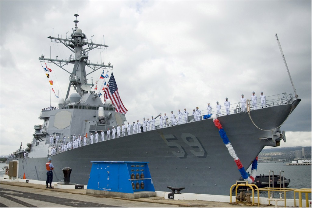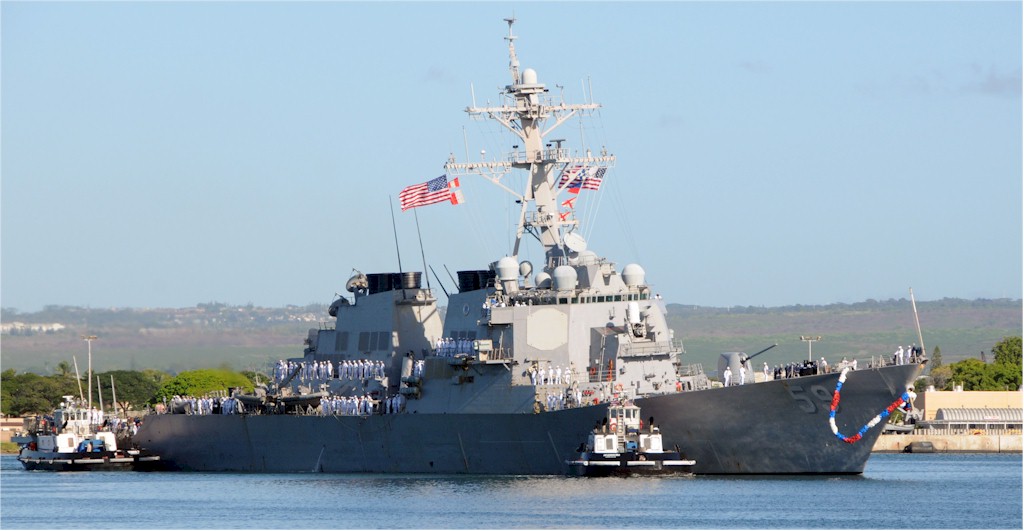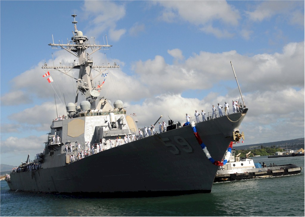 | 136k | 100806-N-3666S-037. Pearl Harbor, August 6 2010, the guided-missile destroyer USS Russell (DDG 59) arrives in Joint Base Pearl Harbor-Hickam after a scheduled seven-month deployment in the U.S. 5th and 7th Fleet areas of responsibility. While on deployment, Russell conducted operations in conjunction with coalition partners deployed to the Middle East, and with the Dwight D. Eisenhower Carrier Strike Group. U.S. Navy photo by Mass Communication Specialist 2nd Class Robert Stirrup. | Bill Gonyo |