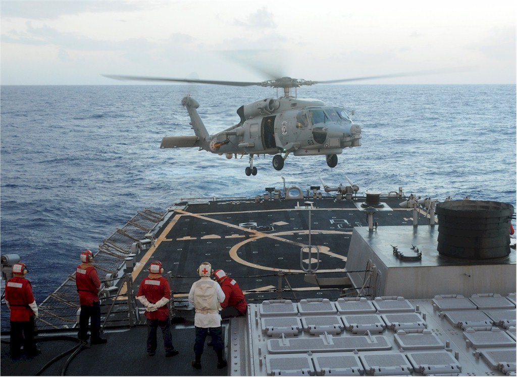 | 157k | Japan Maritime Self-Defense Force Mitsubishi SH-60J Seahawk helicopter from JS Haruna (DDH-141) lands onboard USS Russell (DDG-59), 17 March 2007. Russell is part of the USS Ronald Reagan (CVN-76) Carrier Strike Group, and is participating in a three-day passing exercise with JMSDF forces. U.S. Navy photo by Gas Turbine System Technician Fireman Derek Webster. VIRIN: 070317-N-6729W-444. | Robert Hurst |