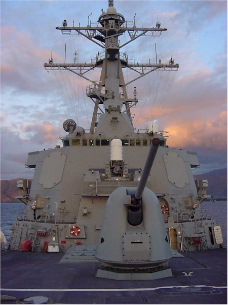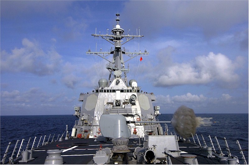 | 111k | Pacific Ocean, August 19 2005, the Arleigh Burke-class guided missile destroyer USS Russell (DDG 59) fires her MK 45 5-inch/54 caliber lightweight gun during a Pre-Aim Calibration Fire (PACFIRE) in the Pacific Ocean. US Navy Photo. | Fred Weiss |