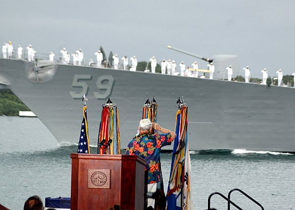 | 54k | 061207-N-4965F-009, Pearl Harbor, Hawaii, December 7 2006, sailors assigned to the Arleigh-Burke class guided-missile destroyer USS Russell (DDG 59) render honors to the USS Arizona Memorial and Pearl Harbor survivors as they perform a Pass-in-Review during a joint U.S. Navy/National Park Service ceremony commemorating the 65th Anniversary of the attack on Pearl Harbor. More than 1,500 Pearl Harbor survivors, their families and friends from around the nation joined more than 2,000 distinguished guests and the general public for the annual observance. U.S. Navy photo by Mass Communication Specialist 1st Class James E. Foehl. | Tony Cowart |