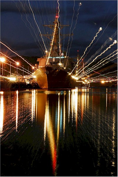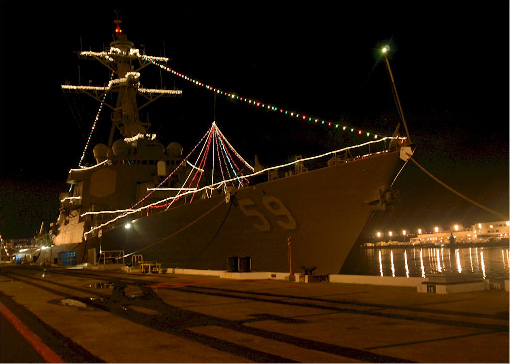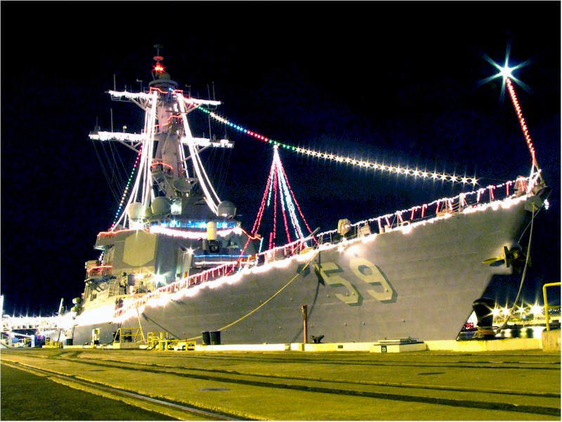 | 89k | 061220-N-4965F-006, Pearl Harbor, Hawaii, December 20 2006, holiday lights shine from Arleigh-Burke class guided-missile destroyer USS Russell (DDG 59) as she sits moored pier side Naval Station Pearl Harbor. Ships currently moored in Pearl Harbor will participate in the 2006 Holiday Light Judging Competition. U.S. Navy photo by Mass Communication Specialist James E. Foehl. | Tony Cowart |