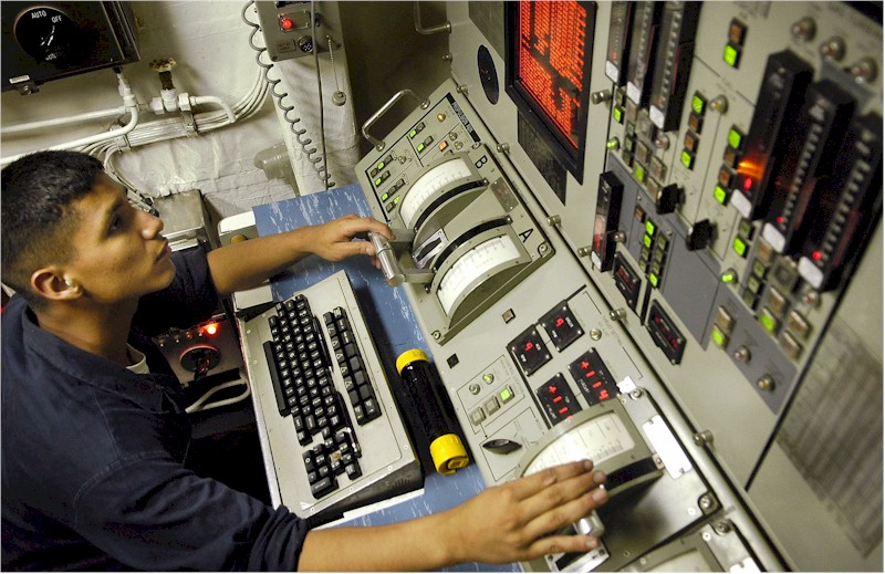 | 143k | 060622-N-4166B-035. Philippine Sea, June 22 2006, Gas Turbine Technician Mechanical Fireman John C. Triesch monitor the main engine room propulsion systems aboard the guided-missile destroyer USS Russell (DDG 59). Russell and the Abraham Lincoln Strike group are currently participating in Exercise Valiant Shield 2006. Valiant Shield focuses on integrated joint training among U.S. military forces, enabling real-world proficiency in sustaining joint forces and in detecting, locating, tracking and engaging units at sea, in the air, on land and cyberspace in response to a range of mission areas. U.S. Navy photo by Photographer's Mate 3rd Class Jordon R. Beesley. | Bill Gonyo |