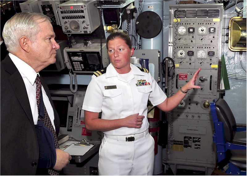 | 150k | 080221-F-6655M-090. Pearl Harbor, Hawaii, February 21 2008, Secretary of Defense (SECDEF) Robert M. Gates receives a tour of the engineering room of the guided-missile destroyer USS Russell (DDG 59) by Lt. Courtney Minetree, chief engineer, while aboard the ship in Pearl Harbor. U.S. Air Force photo by Tech. Sgt. Jerry Morrison | Bill Gonyo |