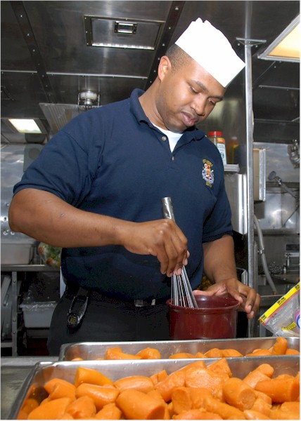 | 70k | 080318-N-9758L-062. Pacific Ocean, March 18 2008, Culinary Specialist 1st Class Derrick Thompson prepares a sweet potato glaze for the evening meal in the enlisted galley aboard the Arleigh Burke-class guided-missile destroyer USS Russell (DDG 59). Russell recently completed training for an upcoming deployment as part of a Carrier Strike Group deployed with the aircraft carrier USS Abraham Lincoln (CVN 72). U.S. Navy photo by Mass Communication Specialist 2nd Class Michael A. Lantron. | Bill Gonyo |