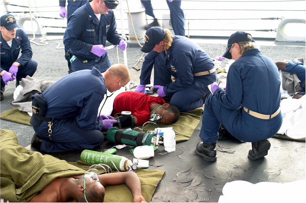 | 212k | 080608-N-XXX0-003. Gulf of Aden, June 8 2008, Interior Communications Electrician 3rd Class Nicholas Mason, one of USS Russell's (DDG 59) stretcher bearers takes vital signs while Russell's First Lieutenant, Ensign Melanie Chambers and Hospital Corpsman 3rd Class Matthew Thompson look on. Ensign Lisa Bydairk, Russell's Communications Officer, records the vital signs for a Somali patient brought aboard Russell. Russell responded to a vessel in distress between Bassasso, Somalia and the Yemeni coast in the Gulf of Aden June 8. The 45-foot small boat experienced serious engine problems leaving it unable to operate at sea and had been adrift for two days. Seven personnel were transferred to Russell and treated for severe dehydration and malnutrition. Russell, deployed as a part of the USS Abraham Lincoln strike Group, is operating as a part of Combined Task Force 150 (CTF 150). CTF 150 conducts maritime Security Operations (MSO) Between the Gulf of Aden and the Gulf of Oman in the Arabian Sea MSO help develop security in the maritime environment. From security arises stability that results in global economic prosperity. MSO complements the counter terrorism and security efforts of regional nations and seek to disrupt violent extremists’ use of the maritime environment as a venue for attack of to transport personnel, weapons or other material. | Bill Gonyo |