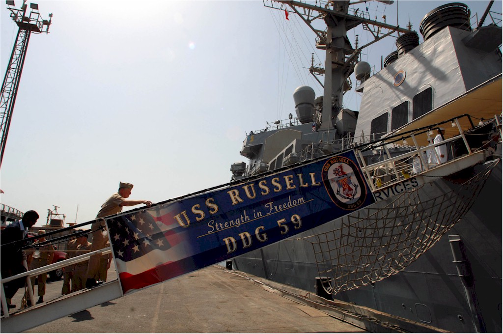 | 130k | 080324-N-0879R-010. Pearl Harbor, Hawaii, March 24 2008, the Pearl Harbor-based guided-missile destroyer USS Russell (DDG 59) departs to join the Abraham Lincoln Carrier Strike Group (CSG-9). The strike group is deploying to support the global war on terrorism . U.S Navy photo by Chief Mass Communication Specialist David Rush. | Robert M. Cieri |