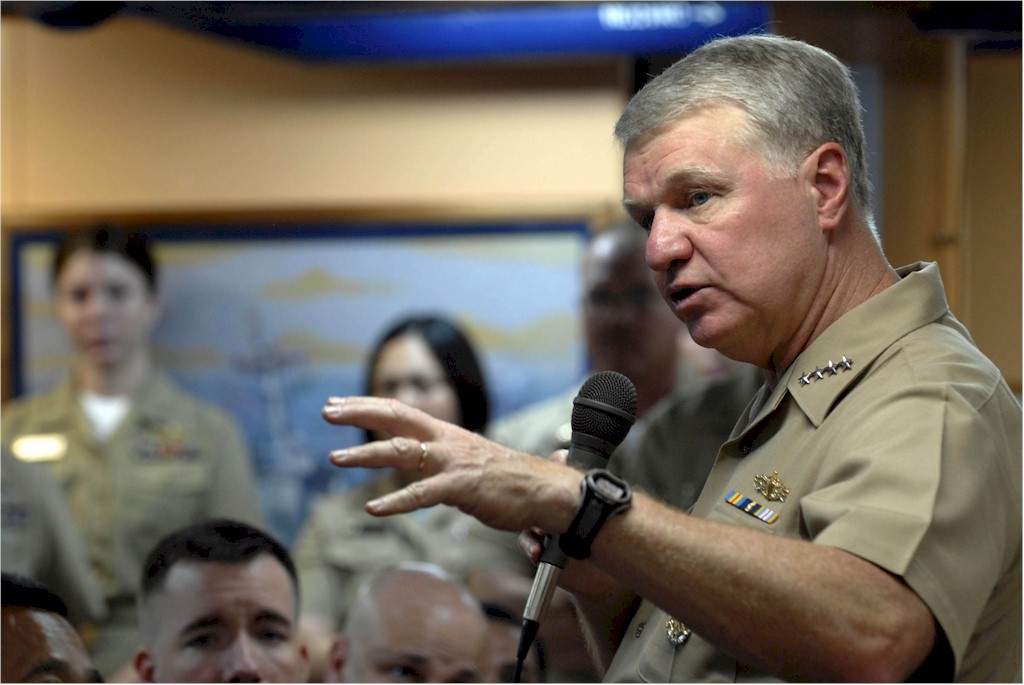 | 126k | 080812-N-8273J-168. Manama, Bahrain, August 12 2008, Chief of Naval Operations (CNO) Adm. Gary Roughead speaks to Sailors during an all hands call aboard the Arleigh Burke-class destroyer USS Russell (DDG 59). Roughead, and Master Chief Petty Officer of the Navy (MCPON) Joe R. Campa Jr. traveled throughout the Central Command Area of Operation to visit Sailors, thank them for their contributions and hear their thoughts firsthand. U.S. Navy photo by Mass Communication Specialist 1st Class Tiffini M. Jones. | Robert M. Cieri |