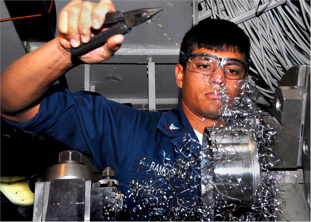 | 246k | U.S. Navy Petty Officer 2nd Class Jose Ramos removes loose strands of metal while churning a used gun shell with a lathe in the machinery repair shop aboard the guided-missile destroyer USS Russell, March 18, 2008. U.S. Navy photo by Petty Officer 2nd Class Michael A. Lantron. | Bill Gonyo |