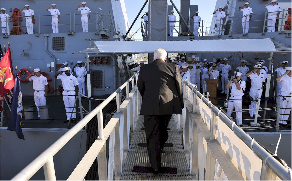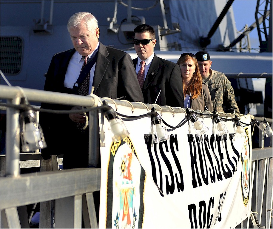 | 203k | 080221-F-6655M-118. Pearl Harbor, Hawaii, February 21 2008, Secretary of Defense Robert M. Gates departing via the gangway of the guided-missile destroyer USS Russell (DDG 59), following his tour of the ship. U.S. Air Force photo by Tech. Sgt. Jerry Morrison. | Robert M. Cieri |