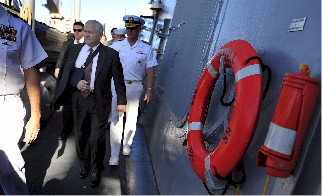| 150k | 080221-F-6655M-102. Pearl Harbor, Hawaii, February 21 2008, Secretary of Defense Robert M. Gates walks along the deck of guided-missile destroyer USS Russell (DDG 59). U.S. Air Force photo by Tech. Sgt. Jerry Morrison. | Robert M. Cieri |