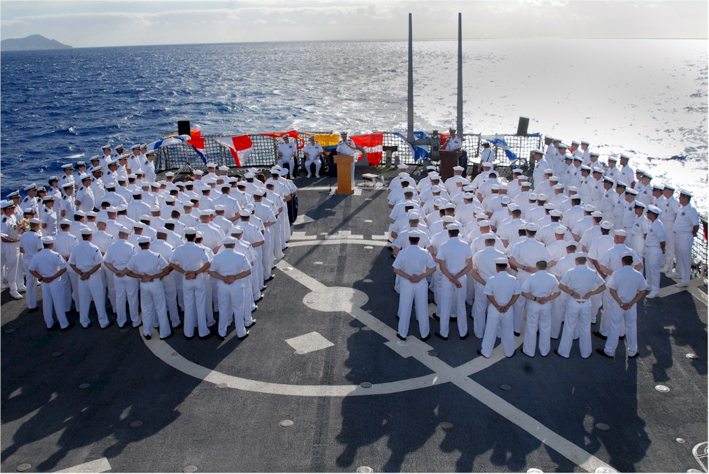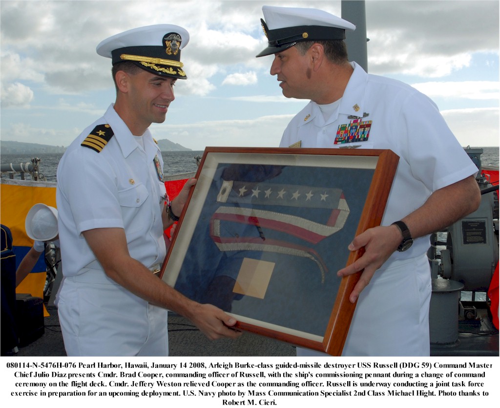| 224k | 080114-N-5476H-046. Pearl Harbor, Hawaii, January 14 2008, sailors stand in ranks during a change of command ceremony on the flight deck of the Arleigh Burke-class guided-missile destroyer USS Russell (DDG 59), in which Cmdr. Jeffery Weston relieved Cmdr. Brad Cooper as Russell's commanding officer. The Russell is underway off the coast of Oahu, with Diamond Head in the background. U.S. Navy photo by Mass Communication Specialist 2nd Class Michael Hight. | Robert M. Cieri |