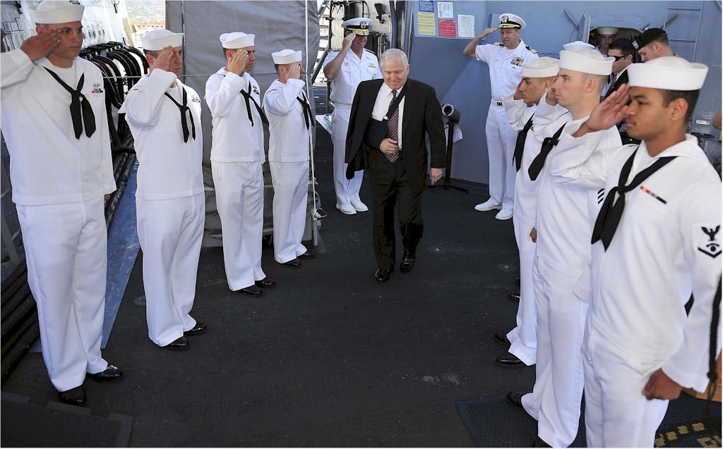 | 165k | 080221-F-6655M-032. Pearl Harbor, Hawaii, February 21 2008, sideboys salute as Secretary of Defense Robert M. Gates commences his departure from the guided-missile destroyer USS Russell (DDG 59). U.S. Air Force photo by Tech. Sgt. Jerry Morrison. | Robert M. Cieri |