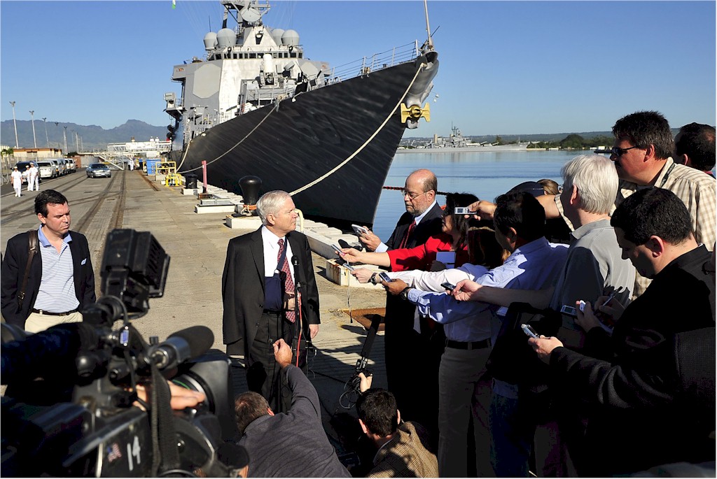 | 192k | 080221-F-6655M-163. Pearl Harbor, Hawaii, February 21 2008, Secretary of Defense Robert M. Gates addresses members of the press after touring the guided-missile destroyer USS Russell (DDG 59). U.S. Air Force photo by Tech. Sgt. Jerry Morrison. | Robert M. Cieri |