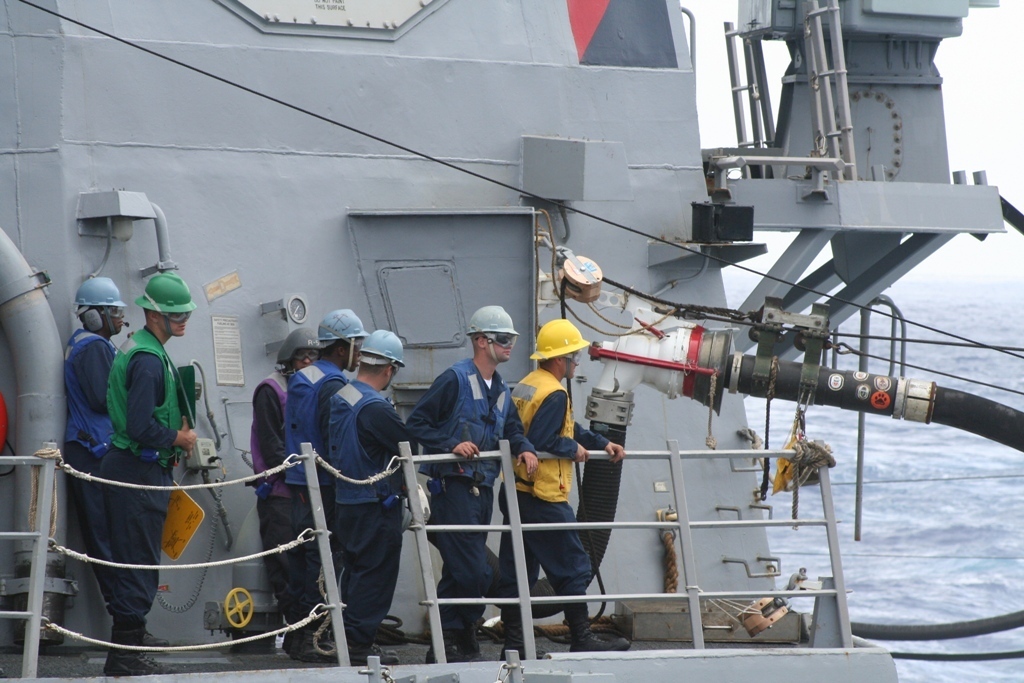 | 299k | Undated, location unknown. Sailors of the USS Russell keep a watchful eye on a refueling station during underway replenishment. Courtesy of the USS Russell. | Bill Gonyo |