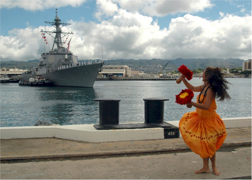 | 186k | 060905-N-4965F-003. Pearl Harbor, Hawaii, September 5 2006, a Polynesian dancer welcomes home the guided-missile destroyer USS Russell (DDG 59) as she returns to her homeport, following a six-month deployment. Russell departed in March as part of the USS Abraham Lincoln (CVN 72) Carrier Strike Group in support of the war on terror and later joined USS Kitty Hawk (CV 63) Carrier Strike Group before returning to its homeport of Pearl Harbor. U.S. Navy photo by Mass Communication Specialist 1st Class James E. Foehl. | Robert M. Cieri |