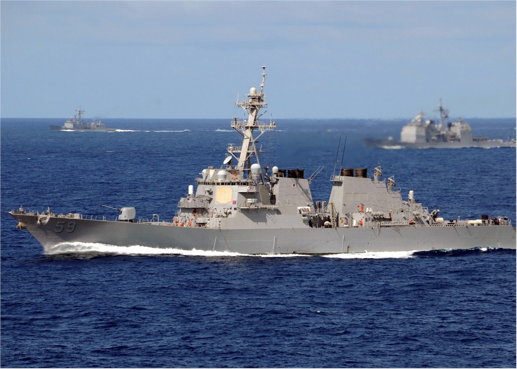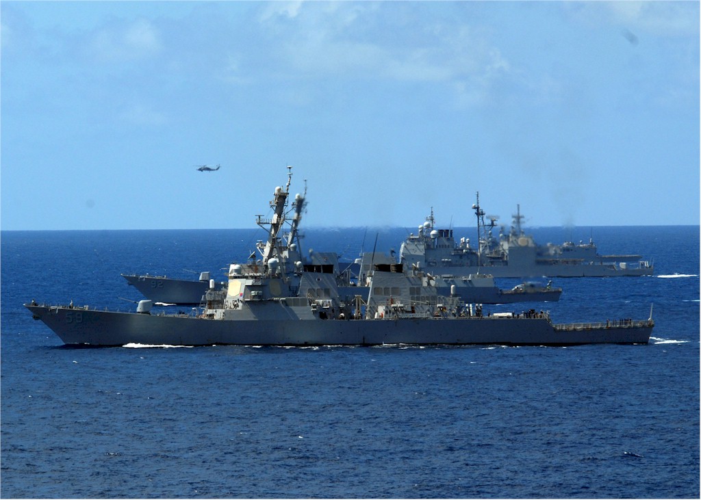 | 161k | 090115-N-9758L-620. Pacific Ocean, January 15 2009, guided-missile destroyers USS Hopper (DDG 70), USS Russell (DDG 59) and USS Paul Hamilton (DDG 60) sail in formation during the Commander, Naval Surface Group Middle Pacific Surface Combatant Group Sail. The group sail supports the Pacific Fleet MIDPAC Surface Combatant Operational Employment program, which calls for nine of the 11 Hawaii-based surface combatants to focus on the western Pacific Ocean by conducting intermediate and advanced training and regular deployments in the western Pacific. U.S. Navy photo by Mass Communication Specialist 2nd Class Michael A. Lantron. | Robert M. Cieri |