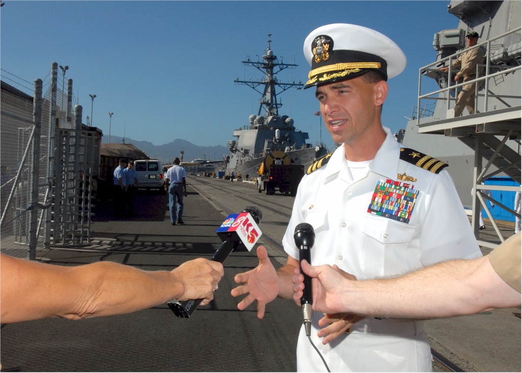 | 176k | 070203-N-4965F-002. Pearl Harbor, Hawaii, February 3 2007, Commanding Officer of the guided-missile destroyer USS Russell (DDG 59) Cmdr. Brad Cooper answers questions for local media on the pier of Naval Station Pearl Harbor. Under the Navy's Fleet Response Plan (FRP), Russell will deploy with Ronald Reagan Carrier Strike Group to the western Pacific in support of U.S. commitments in the region. U.S. Navy photo by Mass Communication Specialist 1st Class James E. Foehl. | Robert M. Cieri |