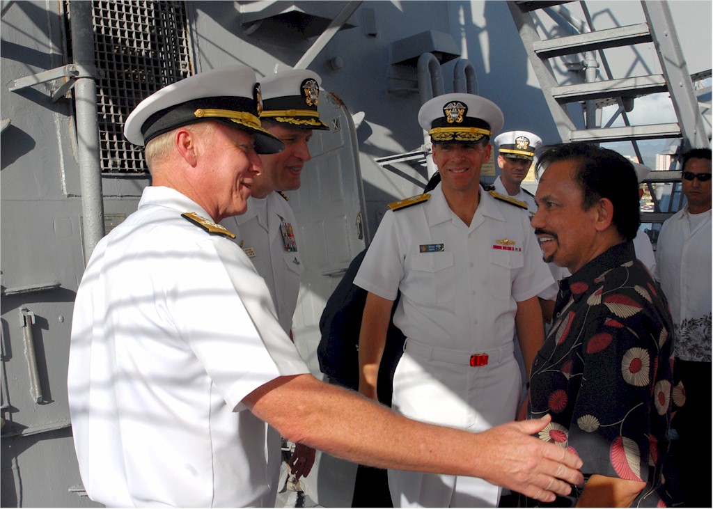 | 184k | 081124-N-5476H-008. Pearl Harbor, Hawaii, November 24 2008, Adm. Robert F. Willard, left, commander, U.S. Pacific Fleet; Cmdr. Jeff Weston, commanding officer of the guided-missile destroyer USS Russell (DDG 59) and Rear Adm. Dixon R. Smith, commander, Navy Region Hawaii, greet his majesty Bolkiah Hassanal, Sultan of Brunei, on the quarterdeck of the Arleigh Burke-class guided-missile destroyer USS Russell (DDG 59). Hassanal is visiting various military installations throughout Hawaii to enhance mutual interest in maritime security and stability and build upon mutual trust and understanding. U.S. Navy photo by Mass Communication Specialist 2nd Class Michael Hight. | Robert M. Cieri |