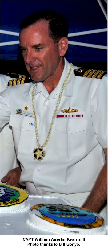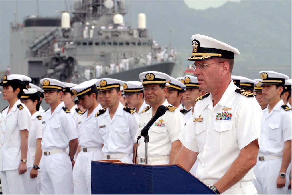 | 145k | 030507-N-3228G-001. Pearl Harbor, Hawaii, May 7 2003, Commanding Officer of the guided missile destroyer USS Russell (DDG 59) Cmdr. William Kearns III, speaks to spectators during a welcoming ceremony for Japanese Maritime Self-Defense Force (JMSDF) Training Squadron ships, JDS Kashima (TV 3508), JDS Hamayuki (DD 126) and JDS Sawagiri (DD 157), seen arriving behind the formation of newly-commissioned Japanese officers. The JMSDF arrived in Hawaii for a five-day visit and will also lay wreaths at the USS Arizona Memorial, the National Cemetery of the Pacific, the Makiki Cemetery, the Ehime Maru Memorial, and take a city tour. U.S. Navy photo by Photographer’s Mate 1st Class William R. Goodwin. | Bill Gonyo |
