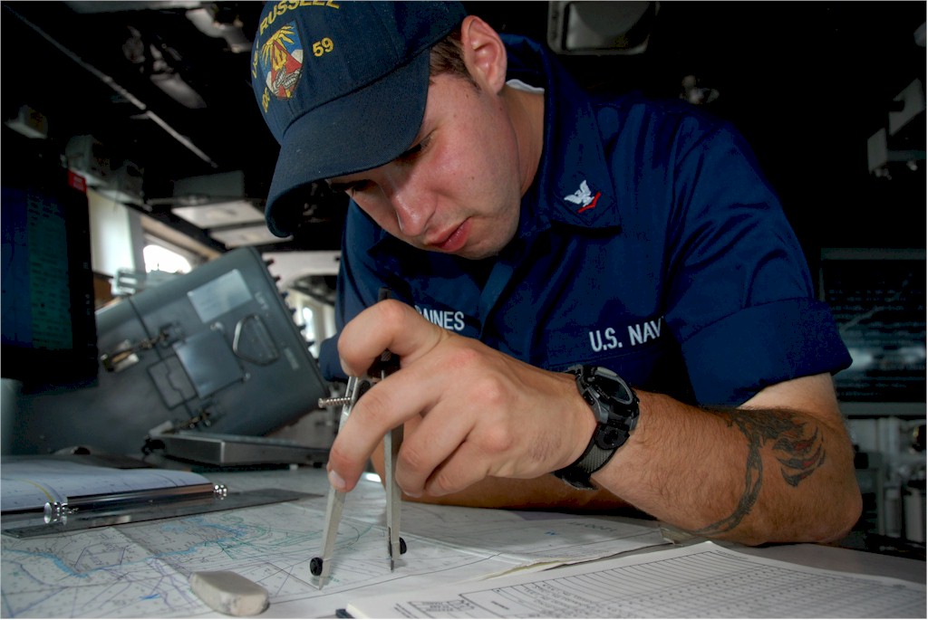 | 139k | 080318-N-9758L-157. Pacific Ocean, March 18 2008, Quartermaster 3rd Class Arthur Baines plots a course on the bridge aboard the Arleigh Burke-class guided-missile destroyer USS Russell (DDG 59) as the ship returns to homeport at Naval Station Pearl Harbor. Russell recently completed training for an upcoming deployment as part of a Carrier Strike Group deployed with the aircraft carrier USS Abraham Lincoln (CVN 72). U.S. Navy photo by Mass Communication Specialist 2nd Class Michael A. Lantron. | Bill Gonyo |