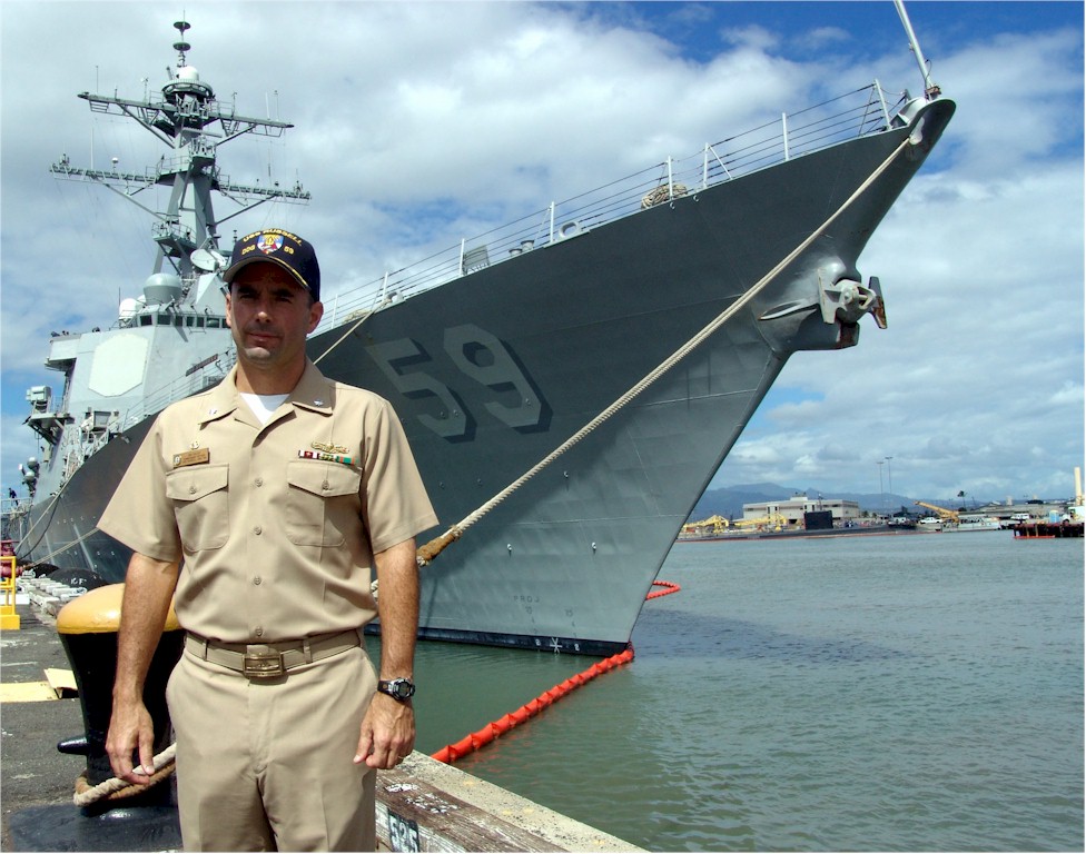 | 181k | 050928-N-9643K-001. Pearl Harbor, Hawaii, September 28 2005, USS Russell (DDG 59) Commanding Officer Cmdr. James W. Kilby stands in front of his ship, after returning from a two-month deployment participating in the Alaska Shield/Northern Edge 2005 Homeland Defense/Homeland Security and Military Support for Civil Authority training exercise. Kilby has been selected to receive the Vice Adm. James B. Stockdale award for inspirational leadership. The fleet award was established in honor of Stockdale, whose distinguished naval career symbolized the highest standards of excellence in both personal example and leadership. Stockdale was a Medal of Honor recipient, former Vietnam prisoner of war, naval aviator and test pilot. U.S. Navy photo by Chief Journalist Joe Kane. | Bill Gonyo |