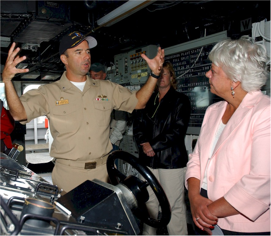 | 172k | 050812-F-4201N-048. Seward, Alaska, August 12 2005, Commanding Officer, USS Russell (DDG 59), Cmdr. Jim Kilby, explains the ship's navigation system on the ship's bridge as he hosts Seward, Alaska's Mayor Vanta Shafer and other members of the City Council. Russell was in Seward for a goodwill port visit Aug. 11-14. Russell is currently participating in the joint exercise Alaska Shield/Northern Edge 2005. Alaska Shield/Northern Edge 2005 is the largest homeland defense/homeland security exercise ever conducted in Alaska. The exercise is the first opportunity within the state to exercise an integrated local, state and federal government response to a series of simulated emergencies including natural disasters, terrorist attacks and mass casualty scenarios. U.S. Air Force photo by Airman 1st Class Anthony Nelson. | Bill Gonyo |