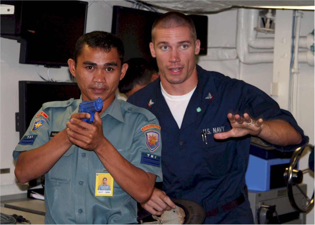 | 149k | Jakarta, Indonesia, August 25 2009, Damage Controlman 3rd Class Derek Holder instructs an Indonesian Sailor about room clearing tactics during Visit, Board, Search and Seizure (VBSS) training aboard USS Russell (DDG 59). Sailors from USS Crommelin (FFG 37) and Russell are working with Indonesian Sailors from Western Fleet Command during Cooperation and Readiness Afloat Training (CARAT) Indonesia 2009. CARAT is a series of bilateral exercises held annually in Southeast Asia to strengthen relationships and enhance the operational readiness of the participating forces. U.S. Navy photo by MC2 Lily Daniels. | Bill Gonyo |