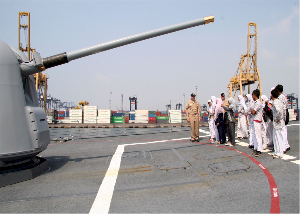 | 164k | 090825-N-506D-208. Jakarta, August 25 2009, Lt. Stephen Henz, chief engineer of the guided-missile destroyer USS Russell (DDG 59), answers questions about the ship's 5-inch gun mount during a ship tour for students of Nural Falah Elementary School in Jakarta, Indonesia. The students were invited to tour the ship after their school received a community relations visit and gifts of sporting goods, from the Russell's Sailors earlier that morning. Sailors from USS Crommelin (FFG 37) and Russell are in Jakarta working with Indonesian sailors from Western Fleet Command during the Indonesian phase of Cooperation and Readiness Afloat Training (CARAT) exercise. CARAT is a series of bilateral exercises held annually in Southeast Asia. U.S. Navy photo by Mass Communication Specialist 2nd Class Lily Daniels. | Robert M. Cieri |