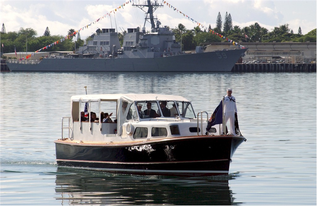 | 186k | President George W. Bush and First Lady Laura Bush are escorted by Admiral Thomas B. Fargo, Commander U.S. Pacific Command, aboard the admiral’s barge for Commander Naval Region Hawaii, for a scheduled visit aboard the retired battleship Missouri (BB-63), and the Arizona Memorial. In the background is the guided missile destroyer USS Russell (DDG-59), at Naval Station Pearl Harbor, Hawaii, October 23 2003. U.S. Navy photo by Photographers Mate 2nd Class Tracy R. Hull. United States Navy News Service 031023-N-0435H-093. | Robert Hurst |