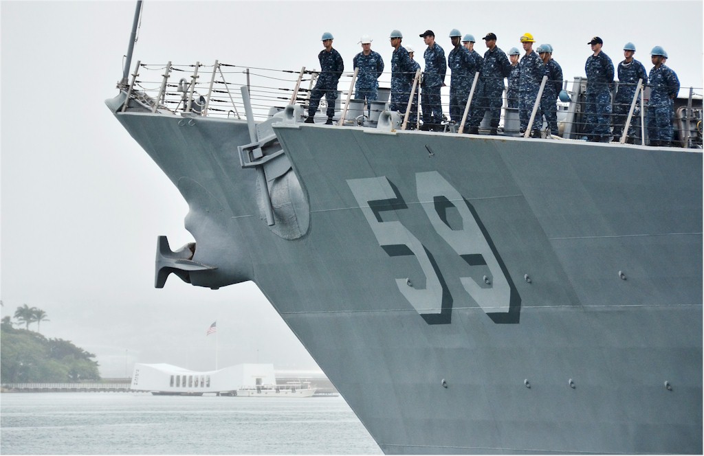 | 134k | 130103-N-RI884-059. Pearl Harbor, January 3 2013, the guided-missile destroyer USS Russell (DDG 59) passes by the USS Arizona Memorial as the ship departs Joint Base Pearl Harbor-Hickam for the last time while homeported in Hawaii. The crew is scheduled to swap hulls with the guided-missile destroyer USS Halsey (DDG 97), homeported in San Diego, in late January. U.S. Navy photo by Mass Communication Specialist 2nd Class Daniel Barker. | Ron Reeves |