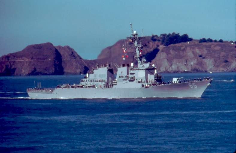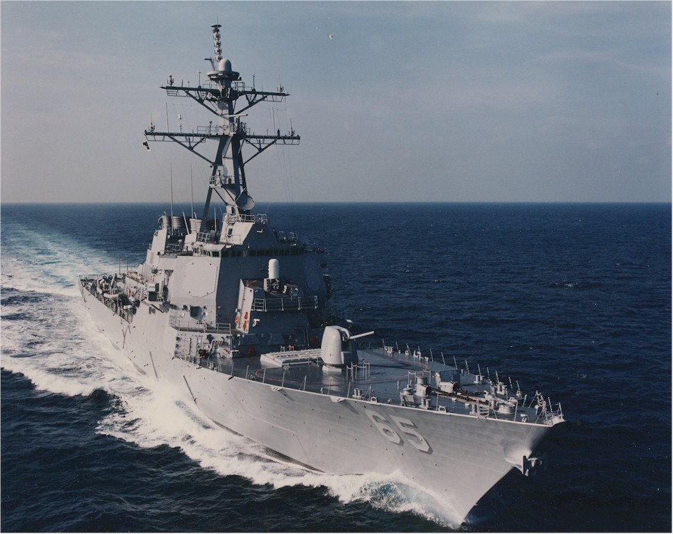 | 65k | 040829-N-9228K-079. Pacific Ocean August 28 2004, guided missile destroyer USS Benfold (DDG 65) cuts through the water during her approach on the aircraft carrier USS Abraham Lincoln (CVN 72) during an underway replenishment (UNREP). Lincoln and Carrier Air Wing Two (CVW-2) are currently conducting operations in preparation for an upcoming deployment. U.S. Navy photo by Photographer's Mate 3rd Class Michael S. Kelly. | Bill Gonyo |