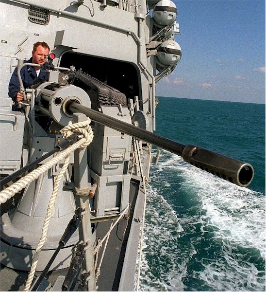 | 145k | November 21st, 1997, on board the destroyer USS Benfold (DDG 65) operating in the Northern Persian Gulf. Gunner's Mate (Guns) 1st Class Joe Brown, from Arlington, Texas, mans a 25mm chain gun while on watch in the Persian Gulf. The ship is home ported in San Diego, California. U.S. Navy photo by Photographer’s Mate 2nd Class Rebecca Kearns. | Fred Weiss |