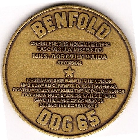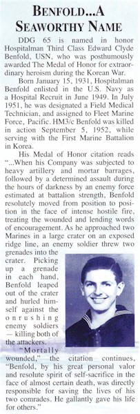 | 51k | Edward Clyde Benfold (January 15, 1931 – September 5, 1952) was a United States Navy sailor who posthumously received the Medal of Honor for his actions during the Korean War. He was killed in action, aged 21, while serving with the 1st Marine Division,as a Hospital Corpsman Third Class. Born in Staten Island, Petty Officer Benfold grew up in Haddon Heights, New Jersey and graduated from Audubon High School in Audubon, New Jersey. Petty Officer Benfold entered the service at Philadelphia, Pennsylvania in 1949. After completion of recruit training in Great Lakes, Illinois, he was selected for "A" school training as a Hospitalman. In July 1951, he was designated as a Medical Field Technician and was ordered to duty with the Fleet Marine Force, Ground, Pacific. He was killed in action while serving with the 2nd Battalion 1st Marines in Korea. He is buried in Beverly National Cemetery, New Jersey. His grave can be found in the distinguished service section, Grave 12. MOH Citation: “For gallantry and intrepidity at the risk of his life above and beyond the call of duty while serving as a Hospital Corpsman, attached to a company in the First Marine Division during operations against enemy aggressor forces in Korea on September 5, 1952. When his company was subjected to heavy artillery and mortar barrages, followed by a determined assault during the hours of darkness by an enemy force estimated at battalion strength, Benfold resolutely moved from position to position in the face of intense hostile fire, treating the wounded and lending words of encouragement. Leaving the protection of his sheltered position to treat the wounded when the platoon area in which he was working was attacked from both the front and the rear, he moved forward to an exposed ridge line where he observed two Marines in a large crater. As he approached the two men to determine their condition, an enemy soldier threw two grenades into the crater while two other enemies charged the position. Picking up a grenade in each hand, Benfold leaped out of the crater and hurled himself against the onrushing hostile soldiers, pushing the grenades against their chests and killing both the attackers. Mortally wounded while carrying out this heroic act, Benfold, by his great personal valor and resolute spirit of self-sacrifice in the face of almost certain death, was directly responsible for saving thelives of his two comrades. His exceptional courage reflects the highest credit upon himself and enhances the finest traditions of the United States Naval Service. He gallantly gave his life for others”. | Robert M. Cieri/Bill Gonyo |