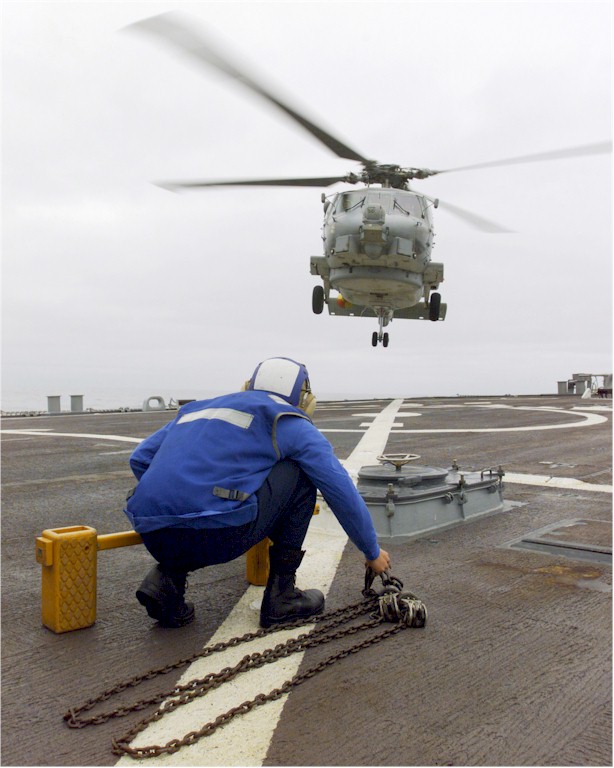 | 98k | 020727-N-5067K-002. Pacific Ocean, July 27 2002, Boatswain’s Mate 2nd Class Christopher D. Hunsberger prepares to chock and chain an SH-60B Seahawk from Helicopter Anti-Submarine Squadron (Light) Four Seven (HSL 47) "Saberhawks" after it lands aboard the guided-missile destroyer USS Benfold (DDG 65). Benfold is currently participating in "Fleet Battle Experiment Juliet" in the Pacific Ocean. U.S. Navy photo by Photographer’s Mate 2nd Class Michael D. Kennedy. | Robert M. Cieri |