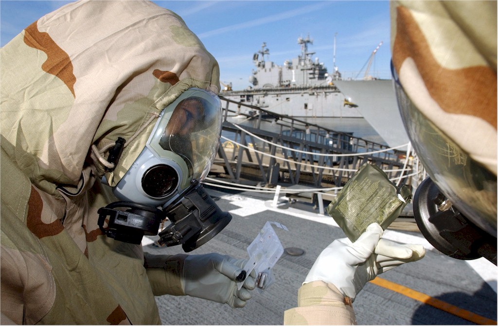 | 175k | 021205-N-6501M-022. Naval Station San Diego, Calif., December 5 2002, during a force protection exercise, Sailors run tests on a substance representing Anthrax which was thrown aboard the guided-missile destroyer USS Benfold (DDG 65) by a simulated intruder on the pier. Force Protection training involves Sailors responding to various potential scenarios of intruder or terrorist activity on or near U.S. Navy ships or installations. U.S. Navy photo by Photographer’s Mate 1st Class Edward G. Martens. | Robert M. Cieri |