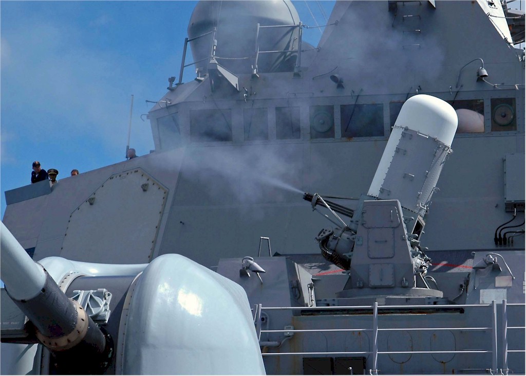 | 124k | 041122-N-4166B-010. Pacific Ocean, November 22 2004, the guided-missile destroyer USS Benfold (DDG 65) conducts a Close-In Weapons System (CIWS) live fire test. Benfold and Carrier Strike Group Nine (CSG-9) are currently deployed to the Western Pacific Ocean. Carrier Strike Group Nine (CSG-9) is the first to be used in the Surge Role in support of the Chief of Naval Operations Fleet Response Plan. U.S. Navy photo by Photographer's Mate Airman Jordon R. Beesley. | Robert M. Cieri |