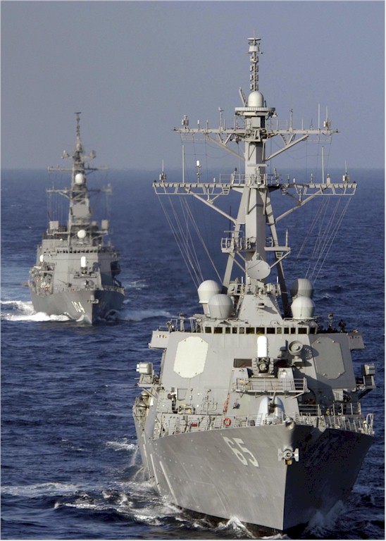 | 111k | 041218-N-8539M-176. Pacific Ocean, December 18 2004, the guided-missile destroyer USS Benfold (DDG 65) and the Japanese Self-Defense Force (JSDF) destroyer JDS Kirisame (DD 104) maneuver aft of the Nimitz-class aircraft carrier USS Abraham Lincoln (CVN 72) during a joint exercise involving several U.S. Navy and Japanese ships. Lincoln and Carrier Air Wing Two (CVW-2) are currently deployed to the Western Pacific Ocean on a scheduled deployment. Carrier Strike Group Nine (CSG-9) is the first to be used in the surge role in support of the Chief of Naval Operations Fleet Response Plan. U.S. Navy photo by Photographer's Mate Airman Nicholas B. Morton. | Robert M. Cieri |