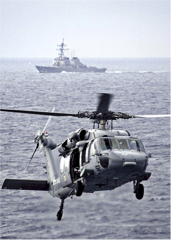 | 223k | 061127-N-8547M-034. November 27 2006, an MH-60S Knighthawk helicopter prepares to land on the flight deck of guided-missile destroyer USS Benfold (DDG 65) during underway replenishment with amphibious assault ship USS Saipan (LHA 2) Nov. 27, 2006. The Ships are deployed in the 5th Fleet area of responsibility conducting maritime security operations in the Gulf of Aden, Gulf of Oman, Arabian Sea, Red Sea, and Indian Ocean. U.S. Navy photo by Mass Communication Specialist Seaman Patrick W. Mullen III. | Robert M. Cieri |