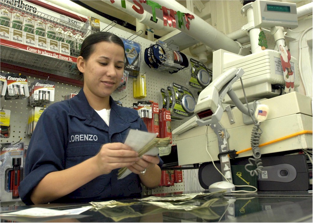 | 212k | 050103-N-9079D-020. Indian Ocean, January 3 2005, Seaman Jaimee Lorenzo counts money while working as a clerk in the ship store aboard the guided-missile destroyer USS Benfold (DDG 65). Benfold, assigned to Carrier Strike Group Nine (CSG-9), is currently conducting humanitarian operations in the wake of the Tsunami that struck South East Asia. CSG-9 is currently operating in the Indian Ocean off the waters of Indonesia and Thailand. U.S Navy photo by Photographer's Mate Airman Ronald Dallatorre. | Robert M. Cieri |