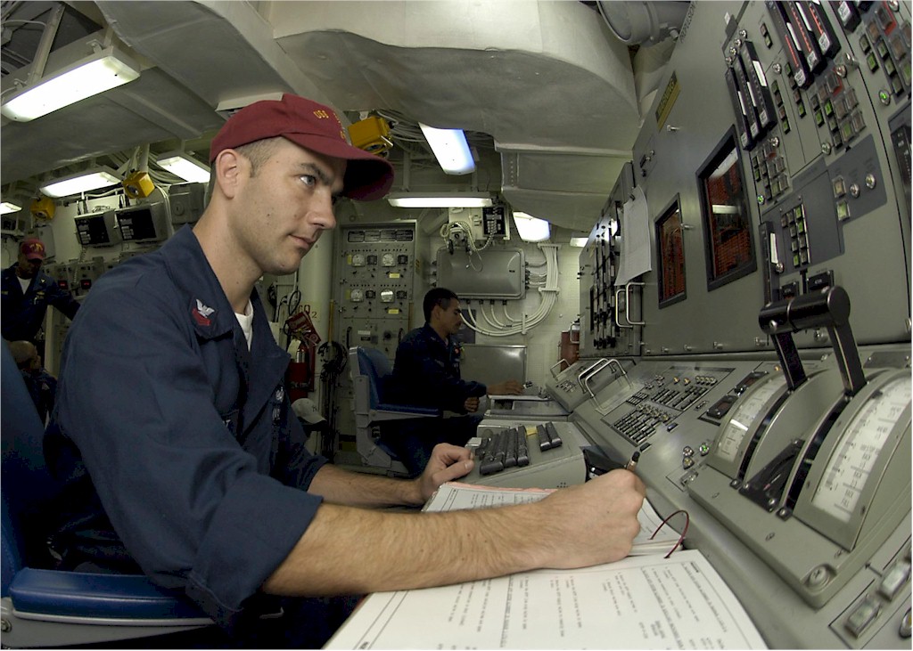 | 184k | 050103-N-9079D-096. Indian Ocean, January 3 2005, Gas Turbine System 1st Class Robert Whynot parallels the generator to maintain proper power in the Central Control Station aboard the guided-missile destroyer USS Benfold (DDG 65). Benfold, assigned to Carrier Strike Group Nine (CSG-9), is currently conducting humanitarian operations in the wake of the Tsunami that struck South East Asia. U.S Navy photo by Photographer's Mate Airman Ronald Dallatorre. | Robert M. Cieri |