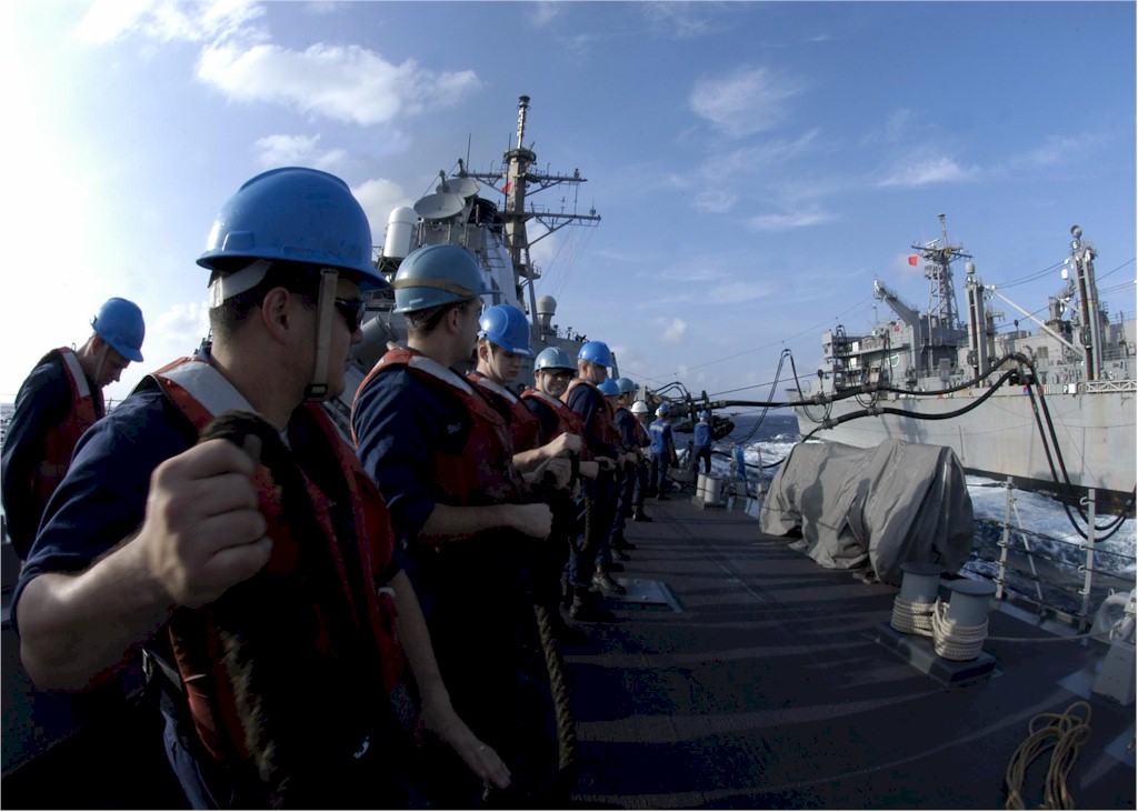 | 144k | 050103-N-9079D-209. Indian Ocean, January 3 2005, sailors aboard the guided-missile destroyer USS Benfold (DDG 65), hold lines during and underway replenishment with Military Sealift Command (MSC) fast combat support ship USNS Rainier (T-AOE 7). Benfold, assigned to Carrier Strike Group Nine (CSG-9), is currently operating in the Indian Ocean in the waters off Indonesia and Thailand. U.S Navy photo by Photographer's Mate Airman Ronald Dallatorre. | Robert M. Cieri |