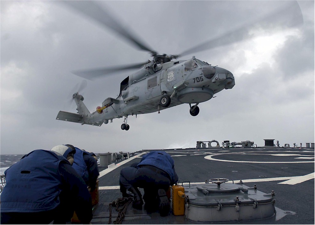 | 121k | 050103-N-9079D-256. Indian Ocean, January 3 2005, sailors keep covered as an SH-60B Seahawk of Helicopter Anti-Submarine Squadron Light Four Seven (HSL-47) "Saberhawks", lands aboard the guided-missile destroyer USS Benfold (DDG 65). U.S Navy photo by Photographer's Mate Airman Ronald Dallatorre. | Robert M. Cieri |
