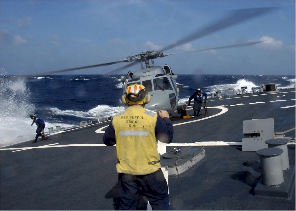 | 138k | 050103-N-9079D-412. Indian Ocean, January 3 2005, sailors work to prepare an MH-60S Knighthawk helicopter from (HSL 47) for flight, as the guided-missile destroyer USS Benfold (DDG 65) takes a turn. U.S Navy photo by Photographer's Mate Airman Ronald Dallatorre. | Robert M. Cieri |