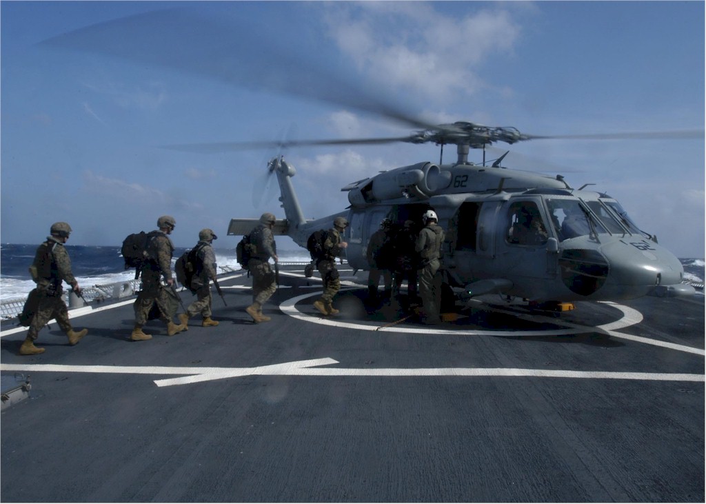 | 131k | 050103-N-9079D-376. Indian Ocean, January 3 2005, Marines assigned to the 3rd Fleet Antiterrorism Security Team (FAST) load into an MH-60S Knighthawk helicopter, assigned to the "Gunbearers" of Helicopter Combat Support Squadron Eleven (HC-11), aboard USS Benfold (DDG 65) to be flown to USNS Rainier (T-AOE 7). U.S Navy photo by Photographer's Mate Airman Ronald Dallatorre. | Robert M. Cieri |