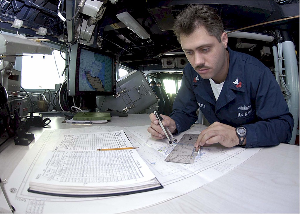 | 143k | 050102-N-9079D-004. Indian Ocean, January 2 2005, Quartermaster 1st class Mike Atchley prepares charts for a transit through the Straits of Malacca on the bridge aboard the guided-missile destroyer USS Benfold (DDG 65). U.S. Navy photo by Photographer's Mate Airman Apprentice Ronald A. Dallatorre. | Robert M. Cieri |